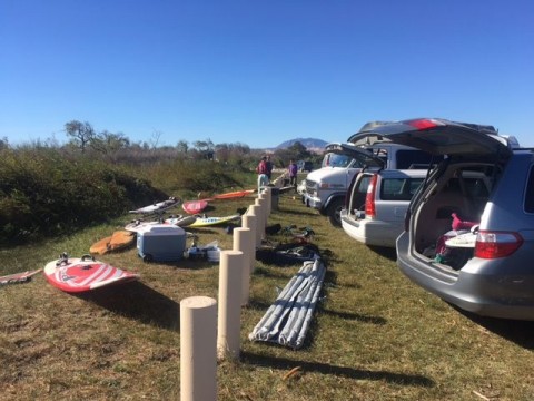 In the run up, I'd had interest from over 20 indivuduals. There's usually a lot of attrition and these events, and worse, as the day drew near, the forecast was for sun, but little wind. At the final count, we ended up with 8 - Myself, Wayne, Dora, Ceci, Christina, Zach, Jamie and Will joining us in the afternoon. We met at the club bright and early, and loaded up with more gear than we thought we'd possibly need. As it turned out later, we did need it.