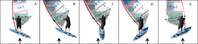 When you are on a broad reach on the new tack, flip the sail (Figure E). To flip the sail, first slide your front hand forward on the boom all the way to the mast. Then let go with your back hand and the sail will flip itself. Grasp the boom on the new side step forward to a normal sailing position, and sail off. You might have to move the sail to the back of the board to head up higher.